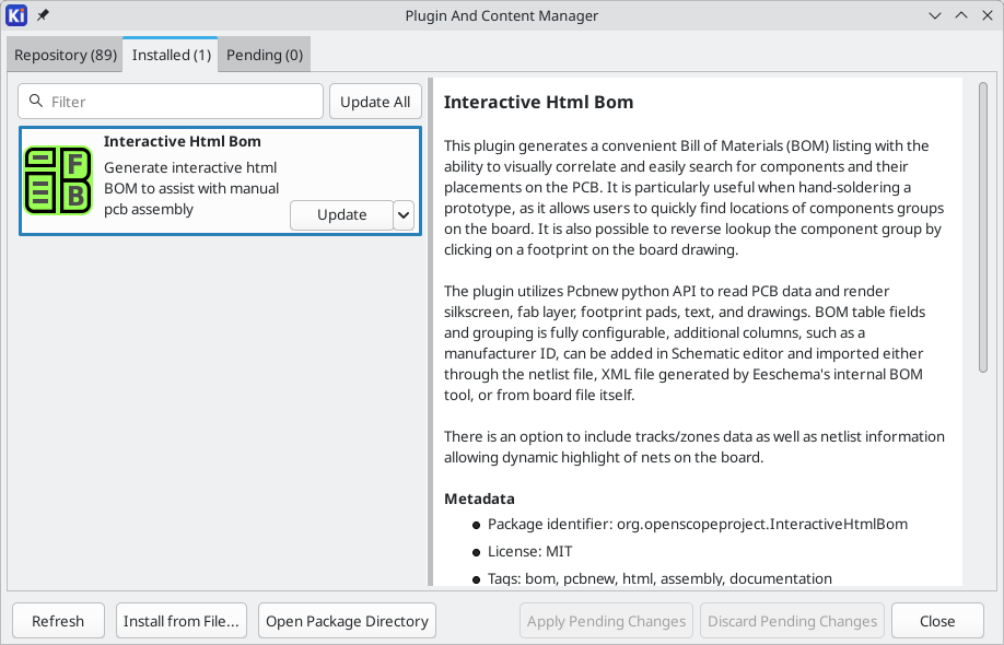 KiCad has a Plugin and Content Manager that lets you browse, install, and manage packages submitted by other users and organizations. Packages can be plugins offering specialized functionality, tools for ordering PCBs from specific manufacturers, libraries of symbols and footprints, or new editor color schemes. You can access the PCM by launching it from the main KiCad Project Manager window.