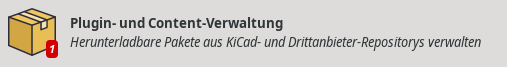 | Pakete können Code installieren, der auf Ihrem Computer ausgeführt wird. Die Pakete werden nicht von den KiCad-Entwicklern entwickelt. Die KiCad-Organisation übernimmt keine Garantie für die Qualität oder Sicherheit der über das PCM installierten Pakete. Stellen Sie sicher, dass Sie nur Pakete installieren, denen Sie vertrauen. |