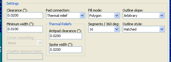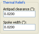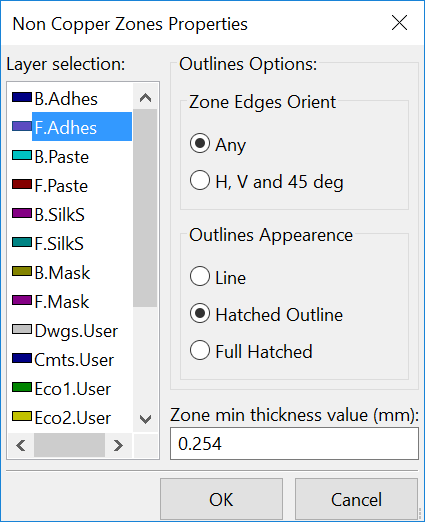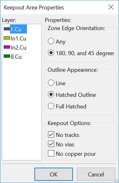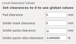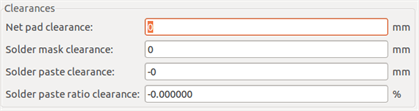 The Objects tab of the appearance panel is similar to the Layers tab. The main differences are that some objects have no color setting and that four types of objects (tracks, vias, pads, and zones) have opacity control sliders. The opacity setting here will be multiplied with any opacity set in the layer colors. By default, all objects are fully opaque except for zones, which are set to translucent in order to make it easier to see objects through filled zone areas.