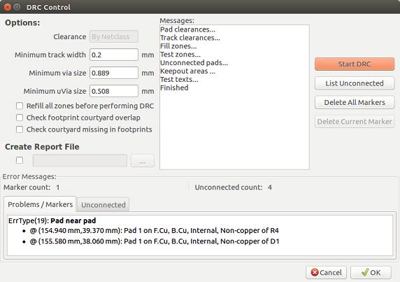 Design rules check (DRC) for automatic detection of design rule violations such as incorrect and missing connections, copper clearance and minimum width violations, and many other design issues