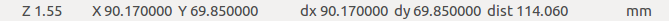The cursor’s current position is displayed at the bottom of the window (X and Y), along with the current zoom factor (Z), the cursor’s relative position (dx, dy, and dist), the grid setting, and the display units.