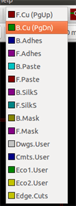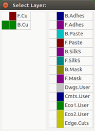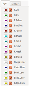 In the Layers tab of the appearance panel, each board layer is shown with its color and visibility state. The active layer is shown highlighted with an arrow indicator to the left of the color swatch. Left-click on a layer to choose it as the active layer. Left-click on the corresponding visibility icon to toggle the layer between visible and hidden. Double-click or middle-click on the color swatch to change the layer’s color.