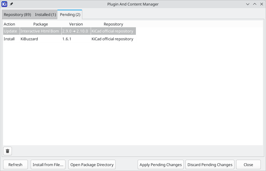 | Packages may install code that runs on your computer. Packages are not developed by the KiCad developers. The KiCad organization does not make any guarantees about the quality or safety of packages installed through the PCM. Make sure you only install packages that you trust. |