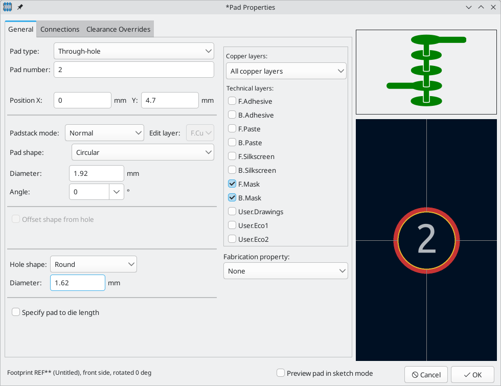 in the right toolbar to place a pad one grid division below the origin, which is (0, 4.7 mm). Press Esc to exit the pad tool, then double click on the pad to edit its properties. Change the pad number to 2 and verify that the position is correct. The switch pins are 1.17 mm x 0.8 mm, which gives a diagonal (maximum pin dimension) of 1.42 mm. Therefore set the hole diameter to 1.42 mm + 0.2 mm = 1.62 mm, and the pad diameter to 1.62 mm + 2*0.15 mm = 1.92 mm to provide a sufficient annular ring.