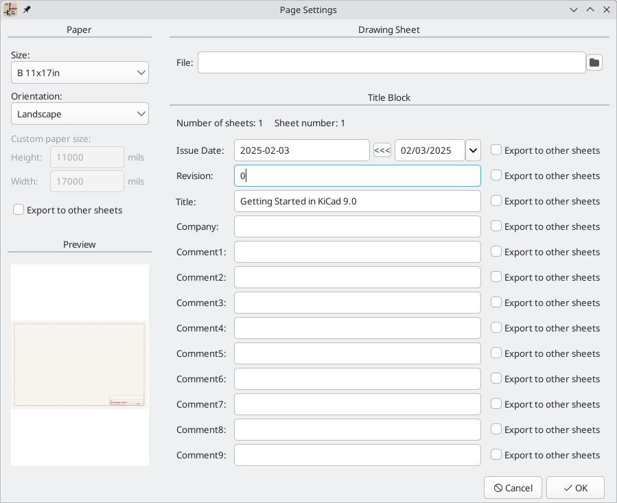 Прежде чем начать рисовать схему, необходимо настроить сам лист схемы. Нажмите Файл → Параметры листа. Дайте схеме название и установите дату. Если хотите, то можете измените размер листа.
