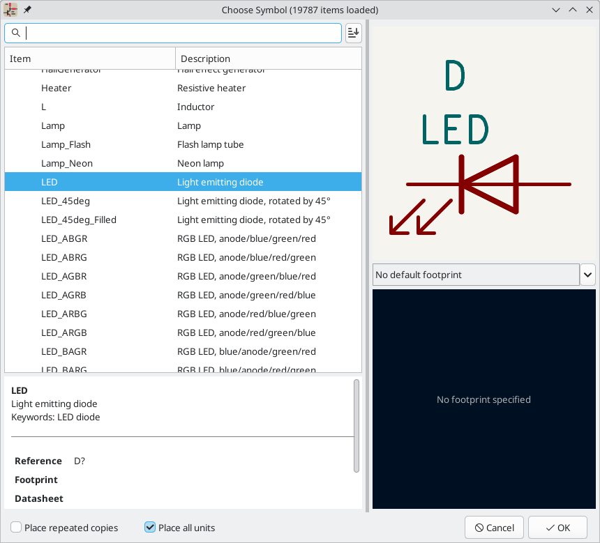 В диалоговом окне «Выбор символа» перечислены доступные библиотеки символов и содержащиеся в них символы компонентов. Основные устройства, такие как пассивные компоненты, диоды и другие общие символы, находятся в библиотеке Device. Конкретные устройства, например, определенный светодиод, могут находиться в других библиотеках.