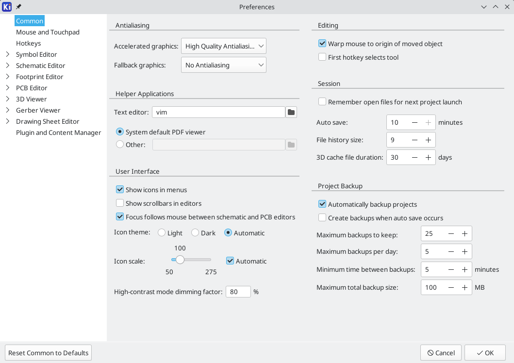 KiCad 能够在多种硬件和操作系统上运行,但在低端硬件上执行某些任务可能会很慢或很困难。为获得最佳体验,建议使用 1920x1080 或更高分辨率的专用显卡和显示器。