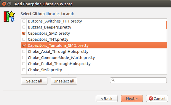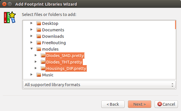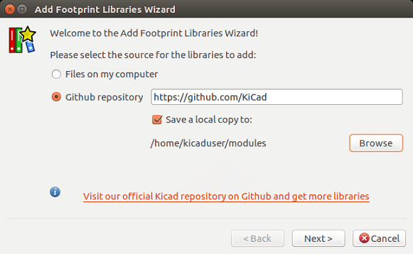 如果你已经安装了标准的 KiCad 封装库并想使用它们,但第一个选项被禁用,选择第二个选项并浏览到安装 KiCad 库的目录中的